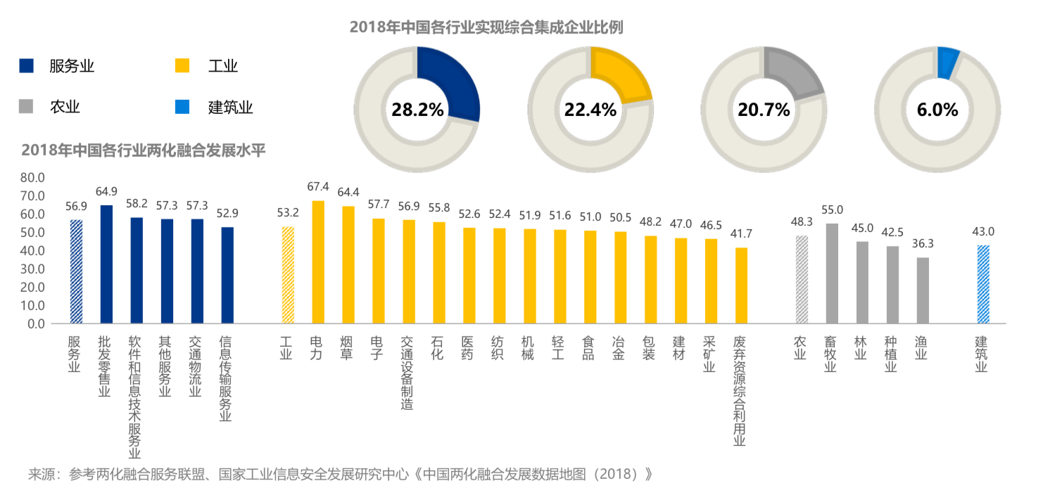 参考国家围绕两化融合的调查,可以看到服务业、工业、农业和建筑业的相对差别。