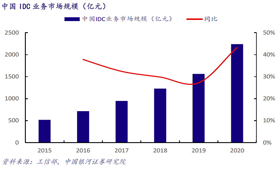 其中,中国电信 IDC 业务体量较大,中国移动IDC 业务收入增长较快,IDC 业务收入增速为54%。