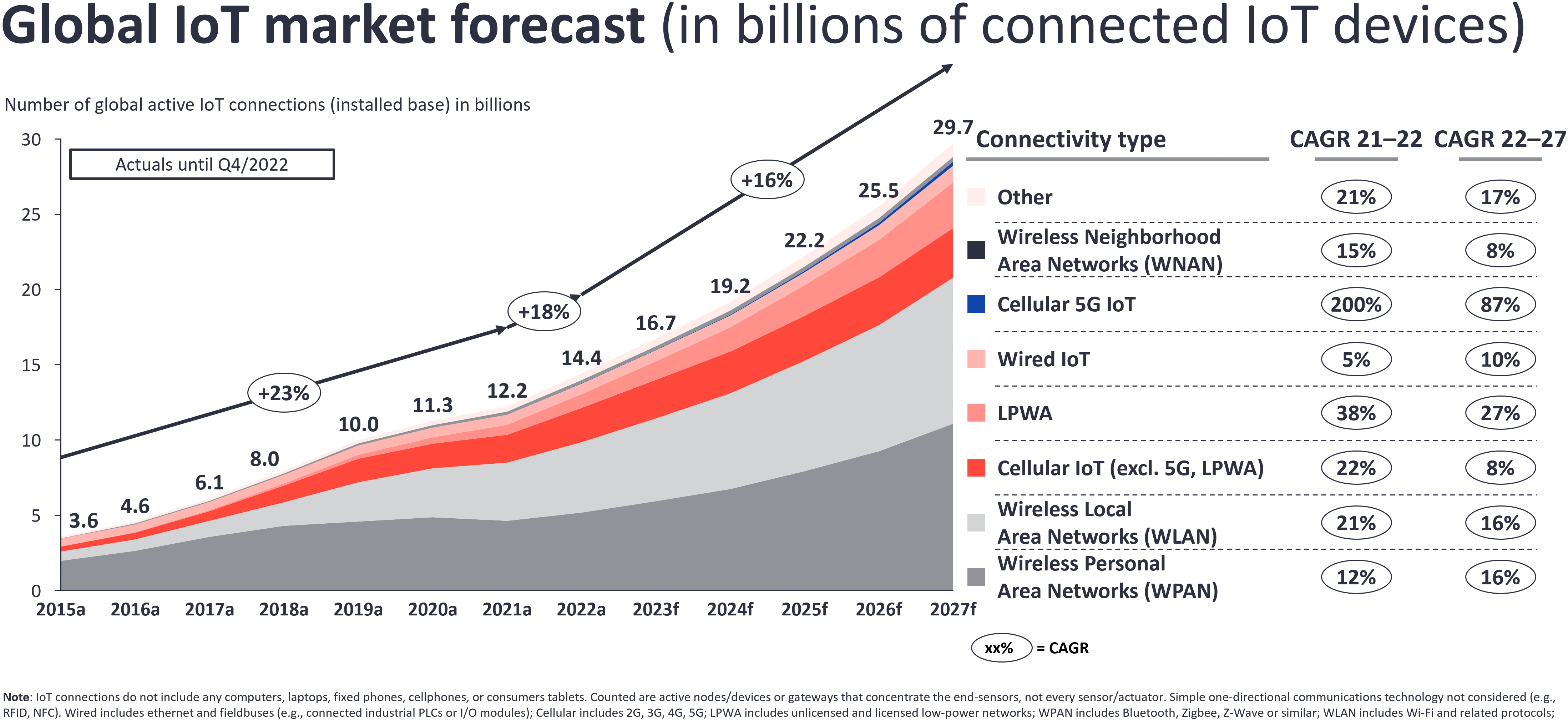 IoT Analytics 咨询公司研究认为 2022 年全球物联网 IoT 的连接数达到了 143 亿,同比增长了 18%。预计到 2023 年总连接数可达到 160 亿,增长 16%。