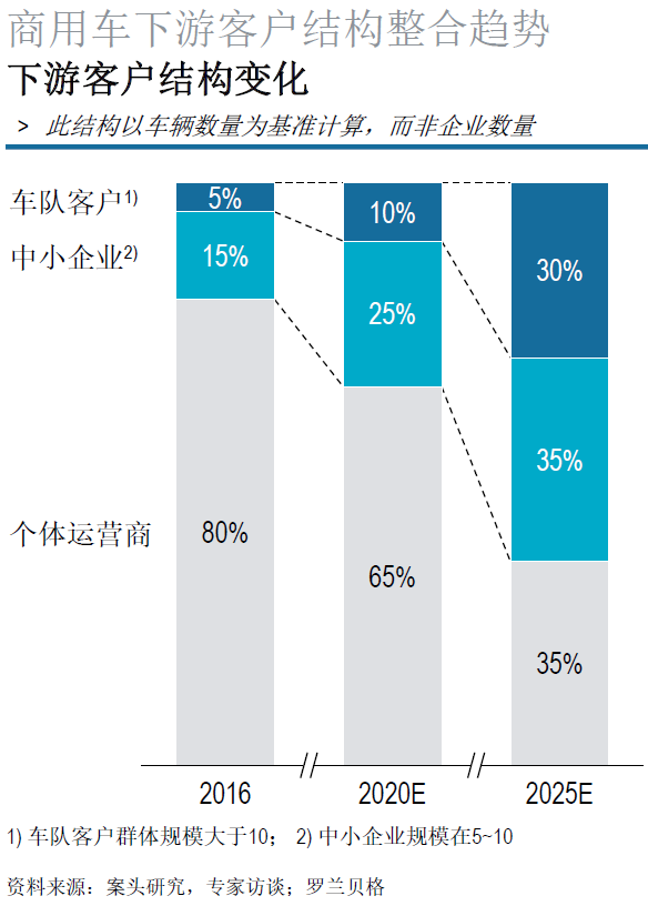 根据罗兰贝格咨询公司的调研,这一趋势正在迅速变化,预计到 2025 年个体运营的商用车数量将从之前的 80% 下降到 35%。