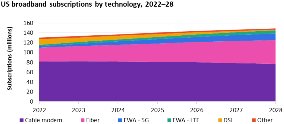 高盛预测到 2026 年,欧洲的固定宽带将有 53.8% 是光纤宽带,而美国则继续处于较低水平。