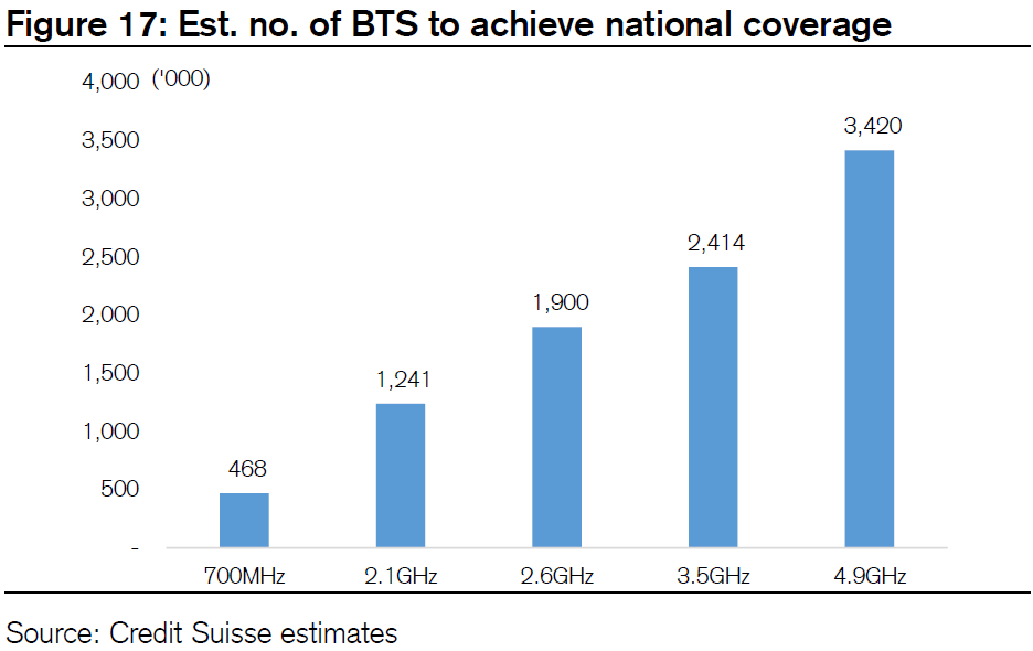 附图来自投资银行 Credit Suisse 的估算,其估算了不同频率条件下,覆盖中国全境需要的基站数。