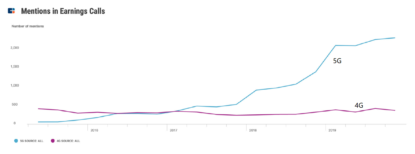 上市公司每个季度需要披露财报数据和经营情况说明,CB Insights 根据对上市公司的发言文本用词进行分析,发现 2019 年的每个季度 5G 都被提及 2000次以上。