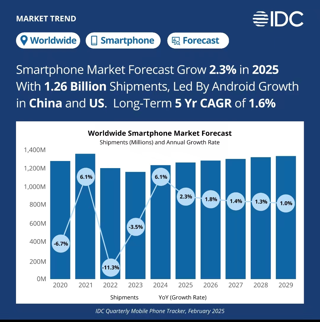 IDC 咨询公司预计 2025 年全球智能手机出货量为 12.6 亿部,同比去年提升 2.3%。
