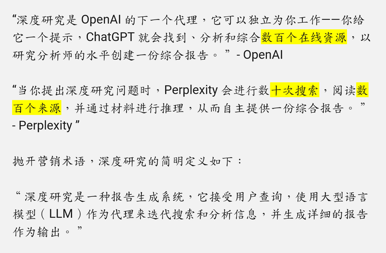 从概念描述看,无论是 OpenAI 和 Perplexity 的描述,都提及,深度研究的过程的数据源来自数百个互联网网站资源。