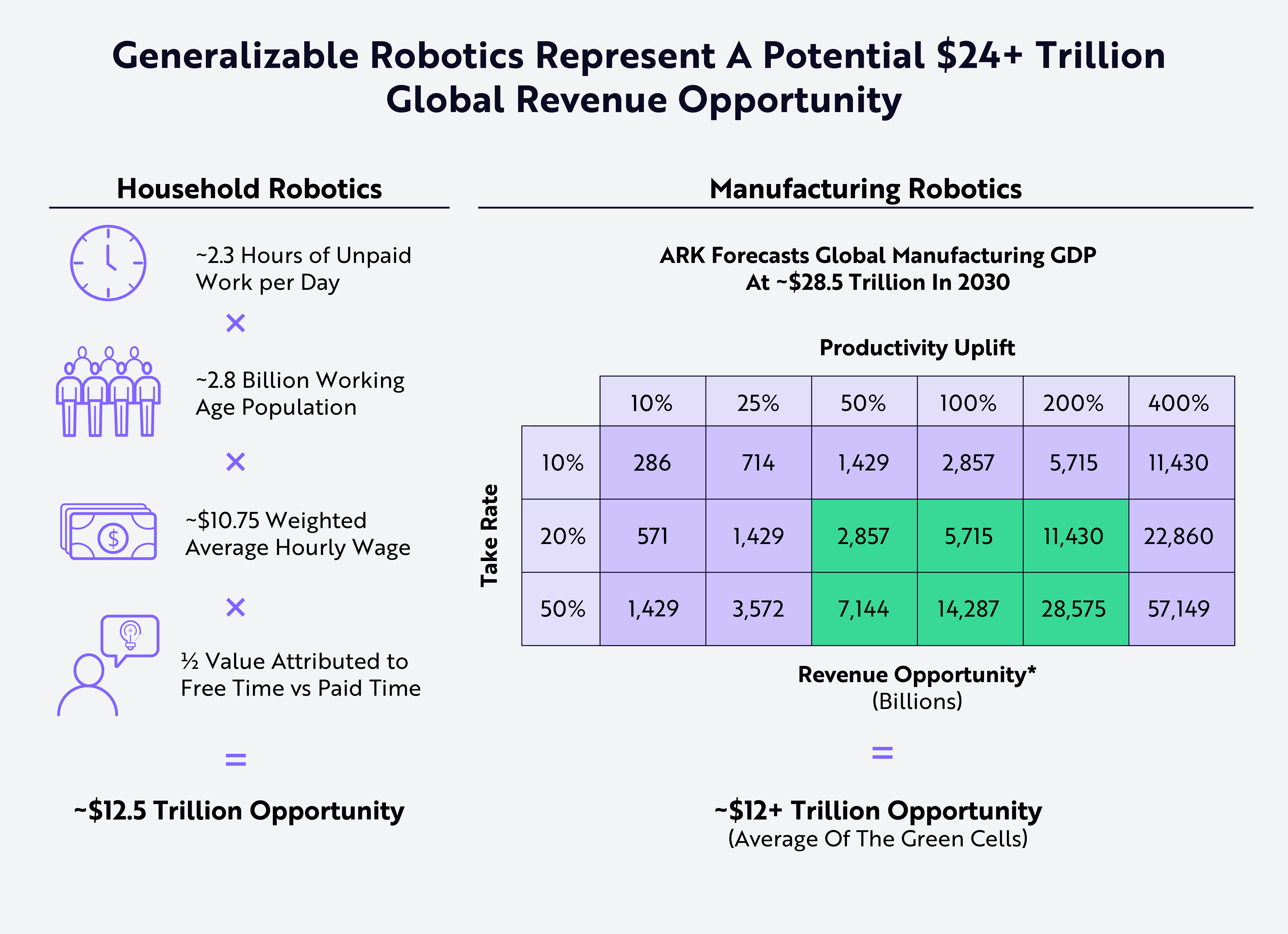 ARK Fund 对通用机器人的市场前景极为看好。其认为到 2030 年,全球家用机器人的市场空间可达 12.5 万亿美元,而制造业的通用机器人也会达到 12 万亿美元。两者合计 24 万亿美元。