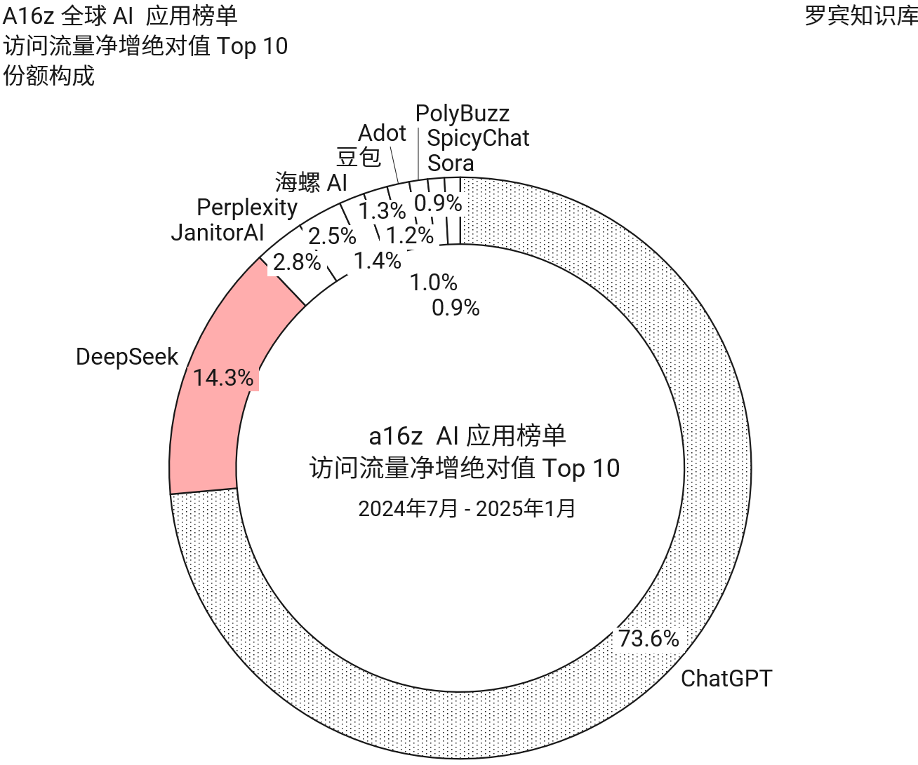 风险投资机构 a16z 于 2025 年 3 月发布的第四版全球 AI 应用榜单中,如果把上榜产品在 2024 年 7 月到 2025 年 1月的流量净增绝对值进行排名。