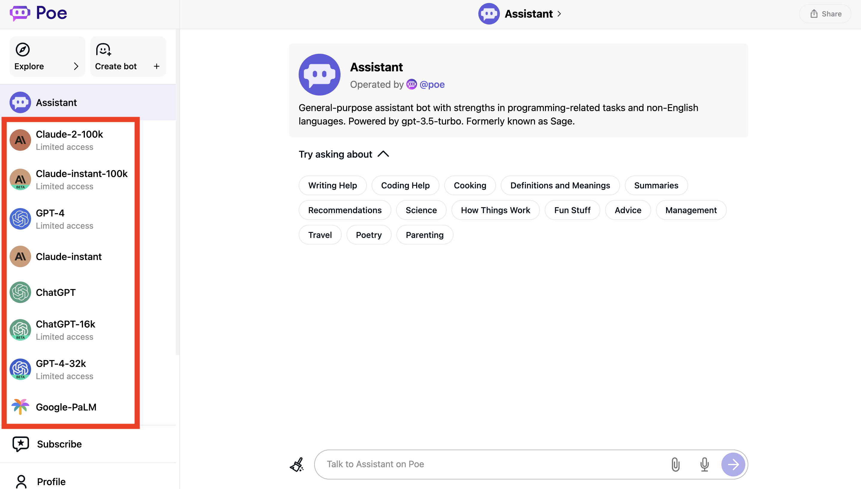 POE 是国际市场代表性的大模型 ”套壳应用”,用户可以在一个对话窗口中选用自己心仪的多个大模型。
