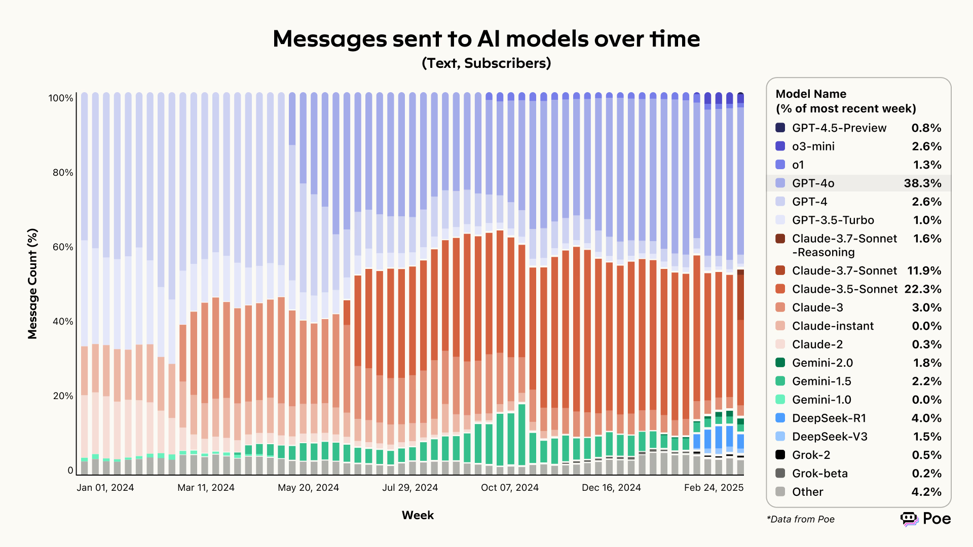 从 POE 这个第三方角度,各家大模型公司的用户使用份额是怎样呢?附图来自 POE 披露的数据,截取自 2024 年 1 月到 2025 年 2 月底。