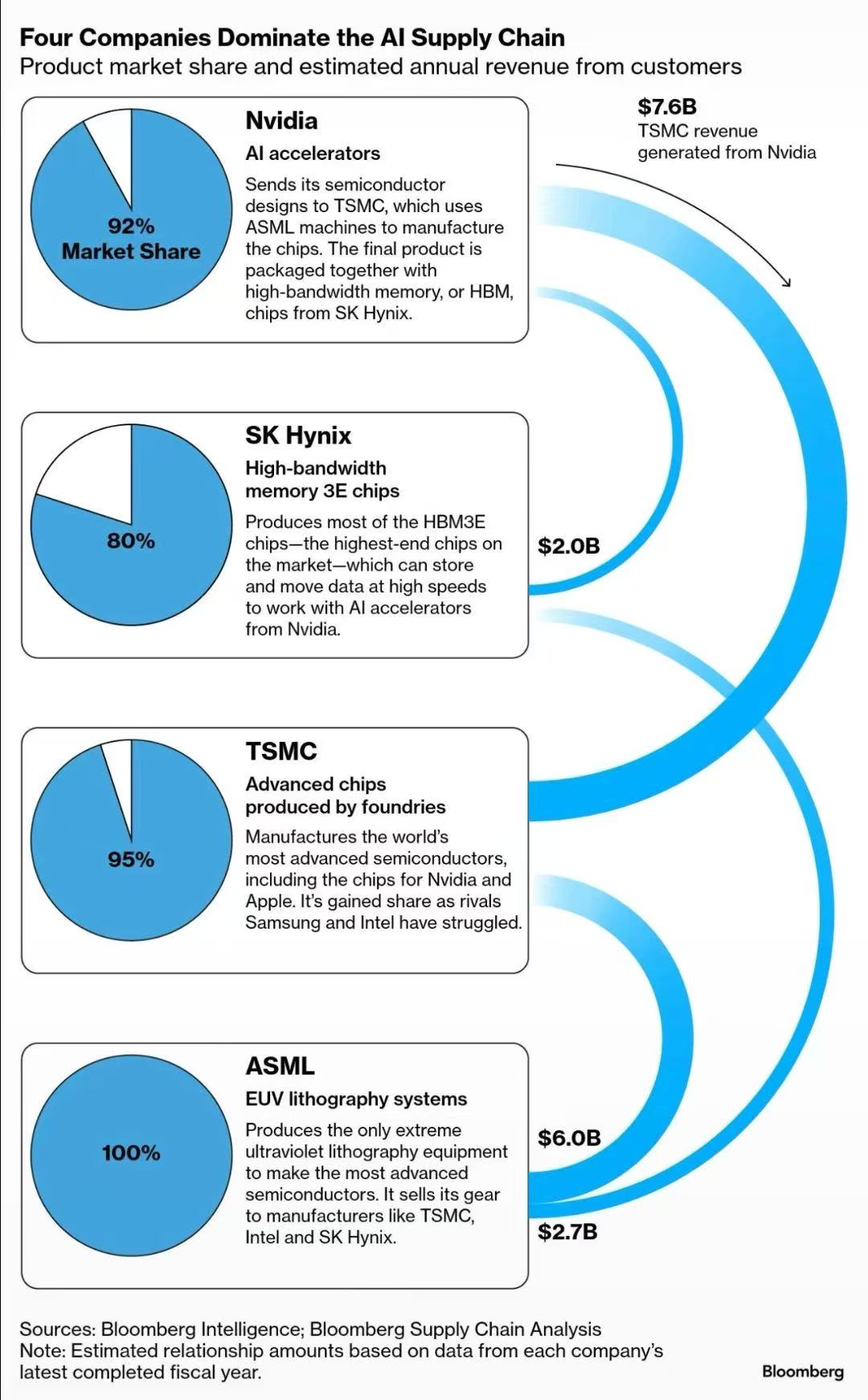 Bloomberg 绘制了一张图,展示了 AI 芯片的四家关键公司(Nvidia、SK Hynix、TSMC 和 ASML)各自的份额以及在供应链上下游关系。