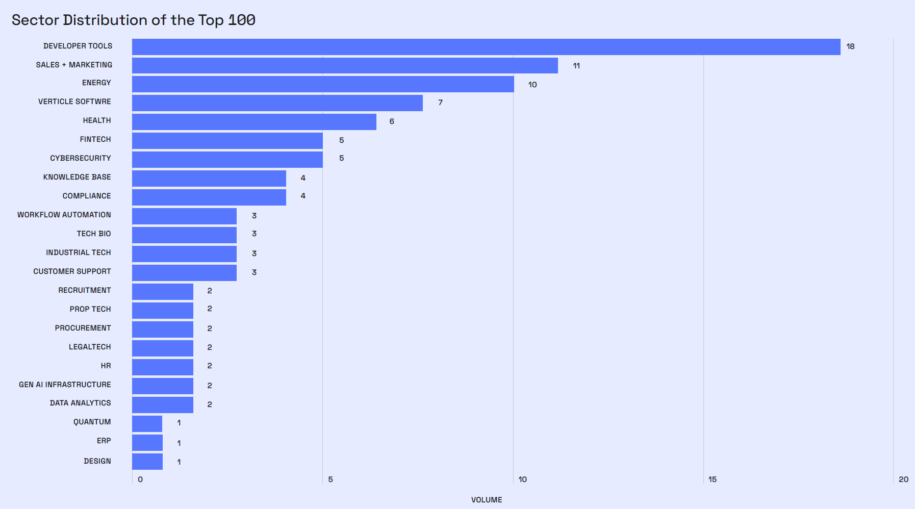 在 Notion Capital 2025 版的 Cloud Challengers Top 100 入选名单中,开发者工具和市场营销是入选企业的最大品类。