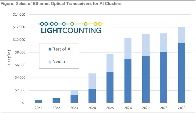 LightCounting 研究显示,2024 年全球 AI 计算集群中的光模块出货量为 1,000 万套,预计到 2029 年有望增长到 1 亿套。