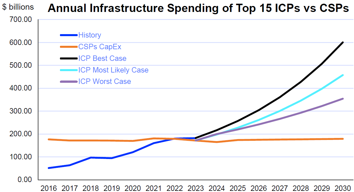 而受制于云计算(公有云)和 AI 的崛起,ICP(互联网内容商)在 CAPEX 的支出日趋加剧。附图是 LightCounting 的预测,其模拟了到 2030 年的三种场景。