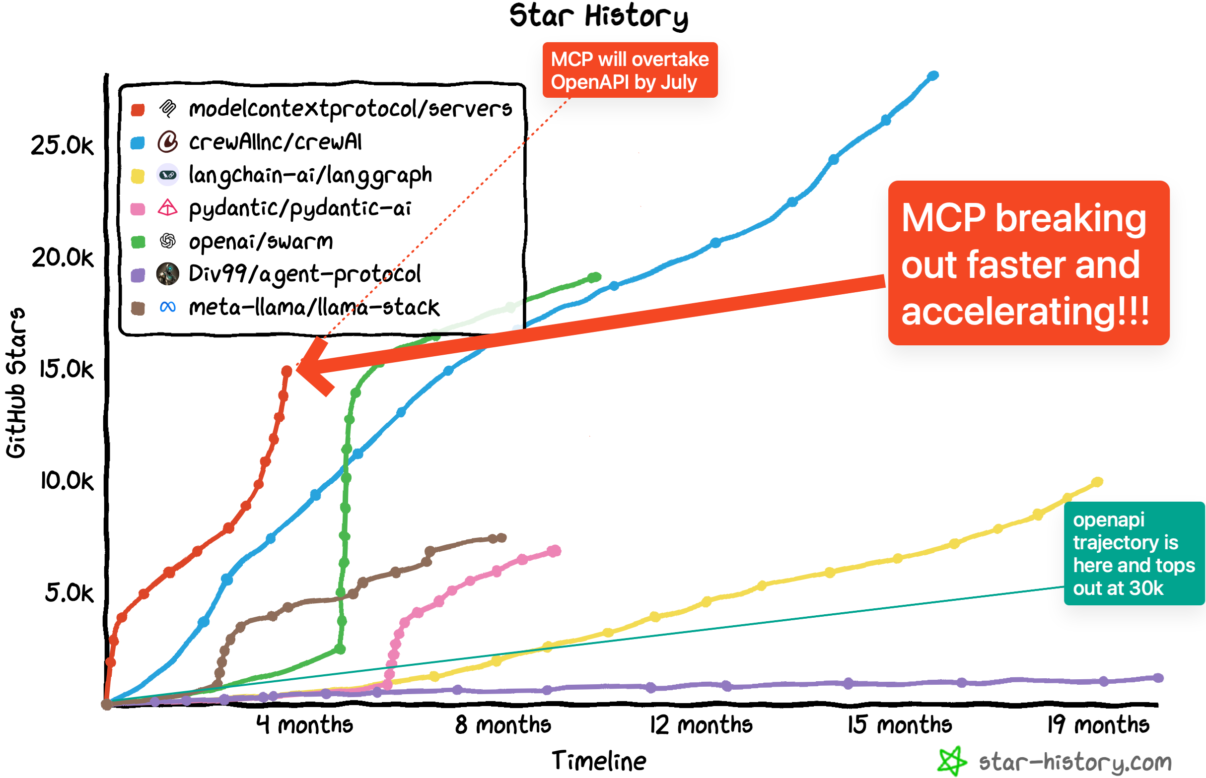 从 GitHub 评分看,MCP 在 2025 年 3 月以后开始加速上扬,可能得益于 OpenAI 和 Google Gemini 宣布支持 MCP,以及 Manus Agent 产品出圈的影响传播。