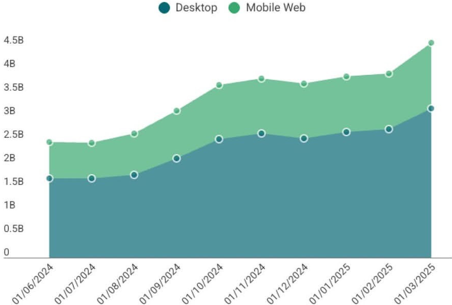 网站数据分析机构 Similarweb 提供了一组数据,可以方便我们了解 ChatGPT 的用户访问规模的进展。
