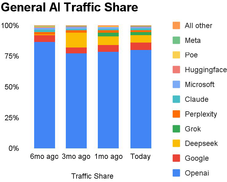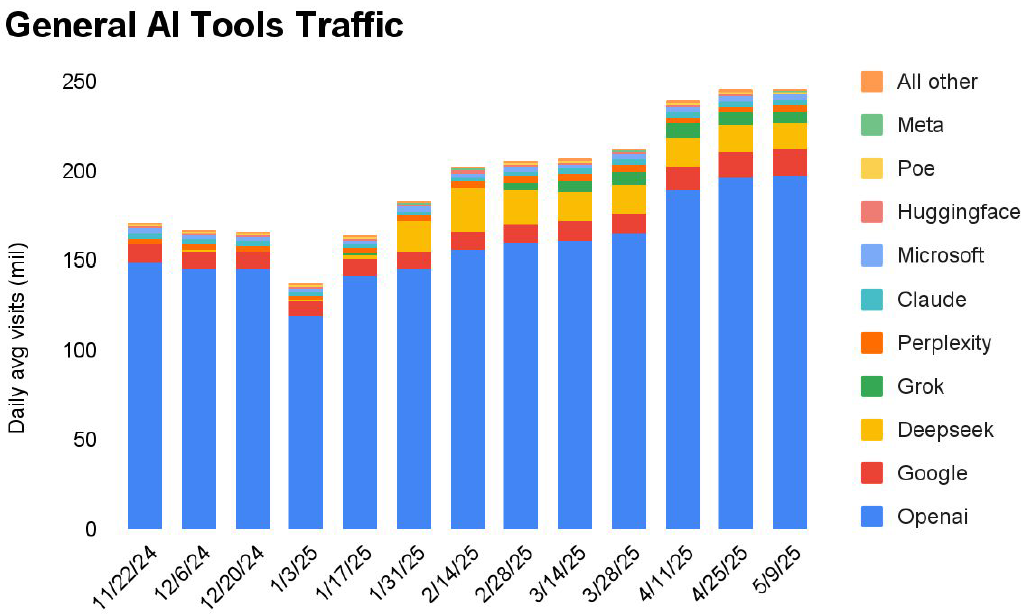 Similarweb 监测数据显示,全球 AI 应用的用户使用在 2025 年 4 月的日均访问量超过 2.5 亿(visits)。从应用类型分布看,八成仍然是通用会话型 AI 工具(ChatGPT 等)。