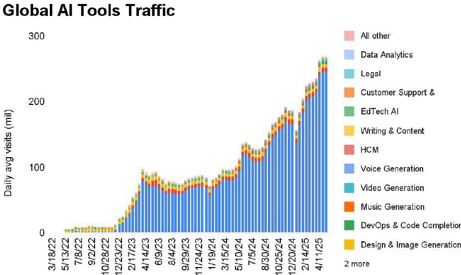 全球通用 AI 工具的日均访问量在 2025 年 4 月底接近 2.5 亿次(visits),从分布看 OpenAI (ChatGPT 等)仍然处于绝对大头份额。