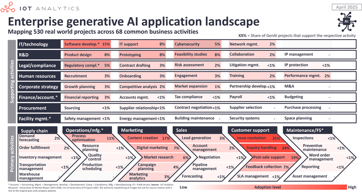 IoT Analytics 咨询公司对 530 个生成式 AI 的真实项目进行了分析,归纳出来 Top 10 应用分别是: