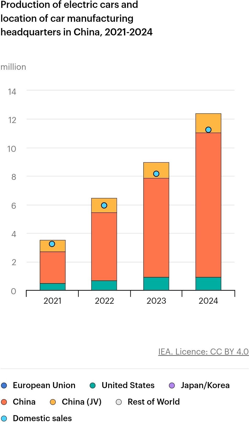 WSJ 绘制了一张图表展示了全球电动汽车的产能和产地分布。预计到 2030 年全球电动汽车的年产能可达 7,000 万辆左右。