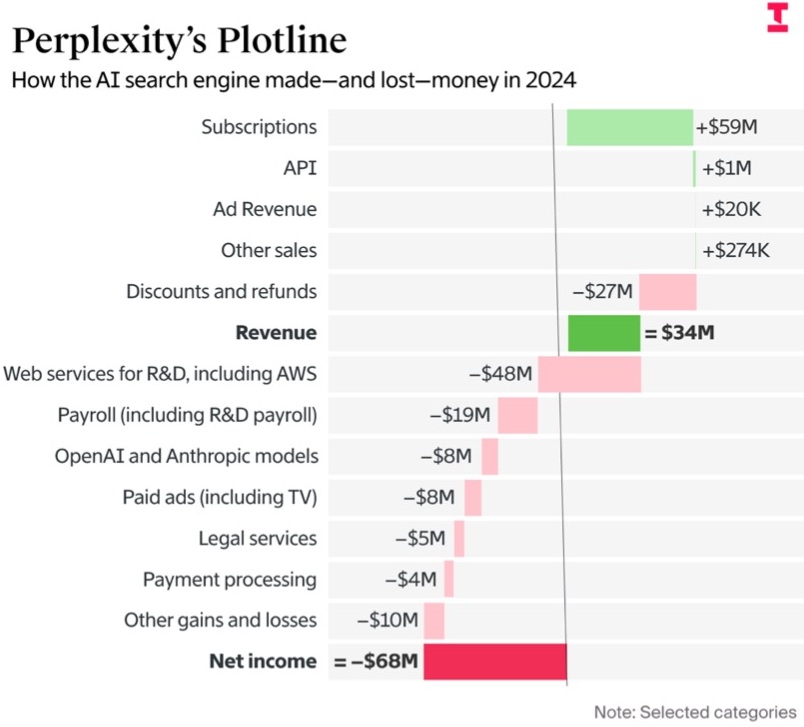 The Information 披露了 AI 搜索引擎服务商 Perplexity 的财务数字,作为初创公司目前还处于大幅亏损状态。