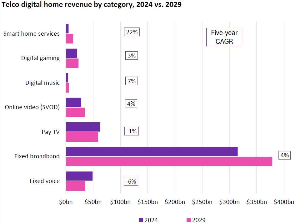 电信运营商数字家庭的不同子赛道的收入空间 2024 vs. 2029