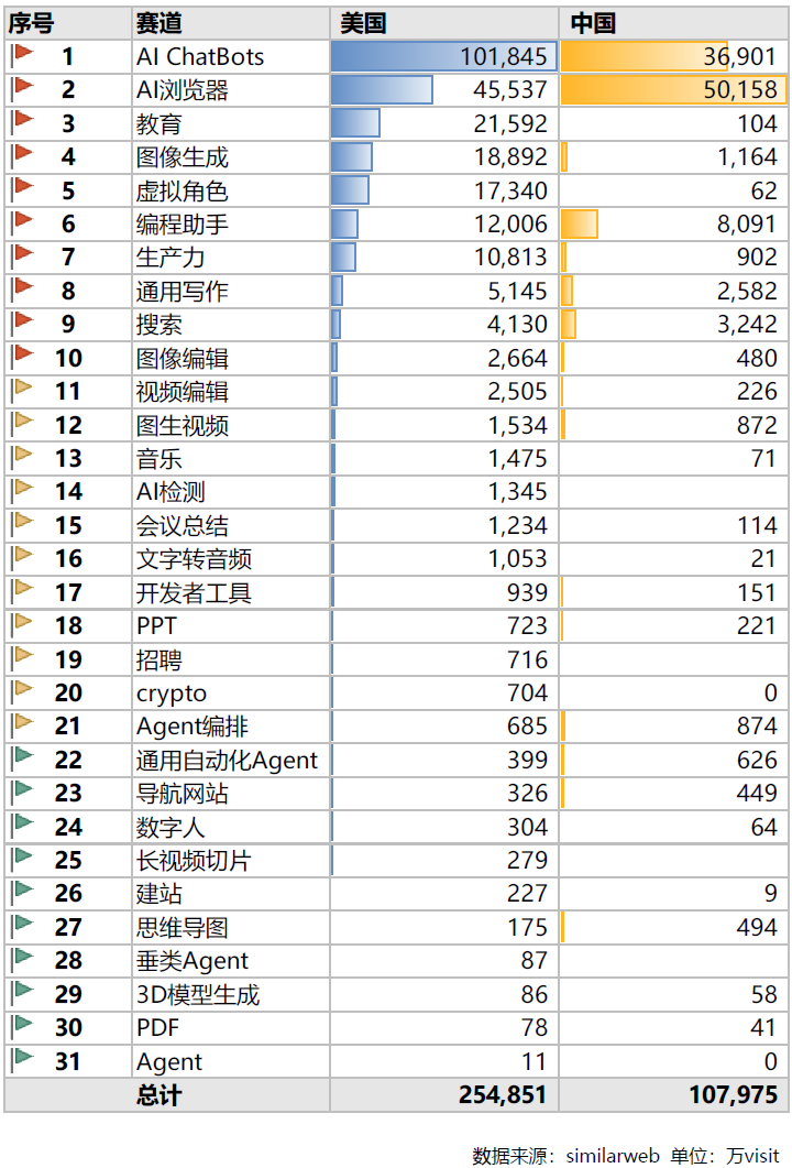 Similarweb 监测数据显示,以 2025 年 3 月为例,美国 Gen AI 的访问使用量达到 254,851 万次访问,而中国的访问使用量为 107,975 万次,中国的流量大约是美国的 42%。