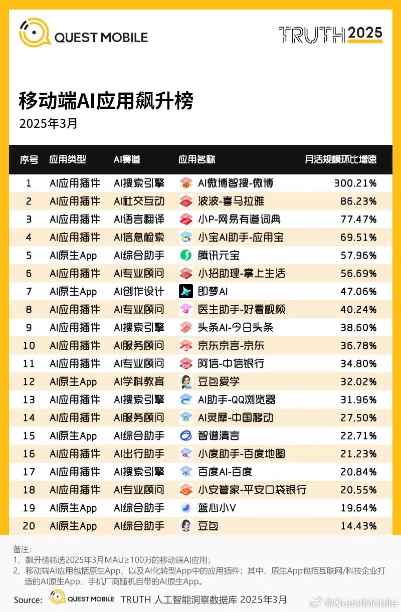Quest Mobile 数据监测显示,2025 年 3 月,微博的 AI 应用插件 “AI 微博智搜” 的月活跃用户数 MAU 在 2025 年 3 月环比增长 300%,成为国内增速最快的 AI 应用插件。