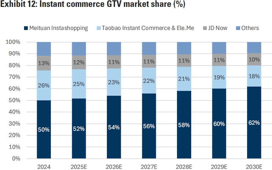 从玩家分布角度,预计到 2030 年美团可拿到 62% 份额。淘宝和京东的份额则分别有所下滑。