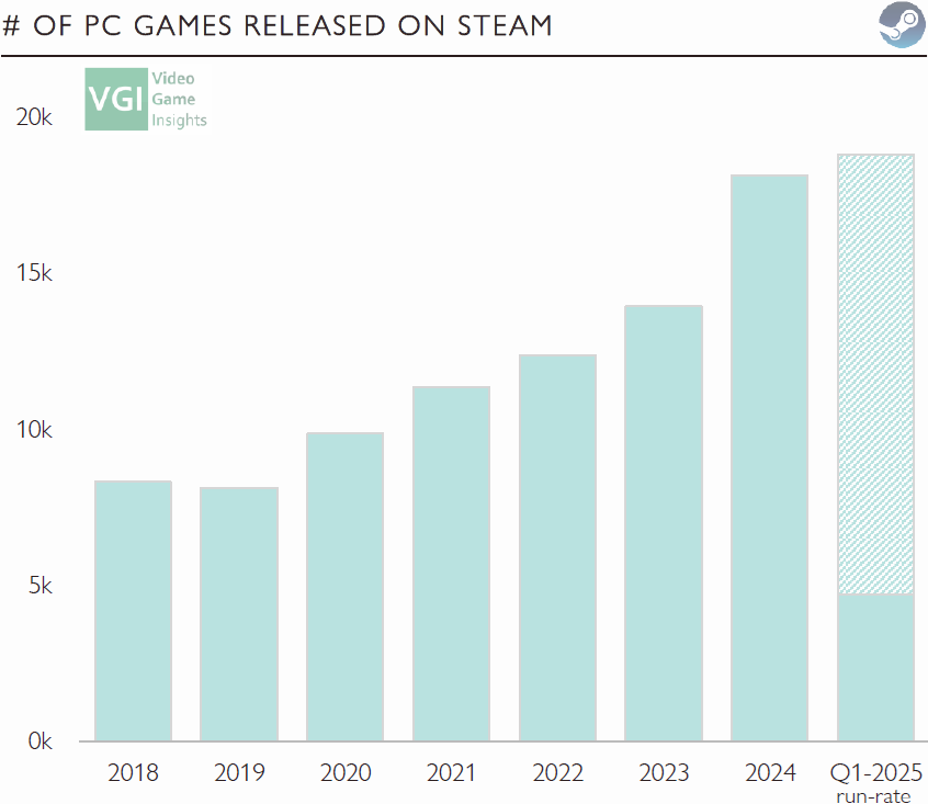 附图分别是 AppStore(代表移动游戏)和 Steam(代表 PC 游戏)过去几年的新款游戏的上市数量统计。