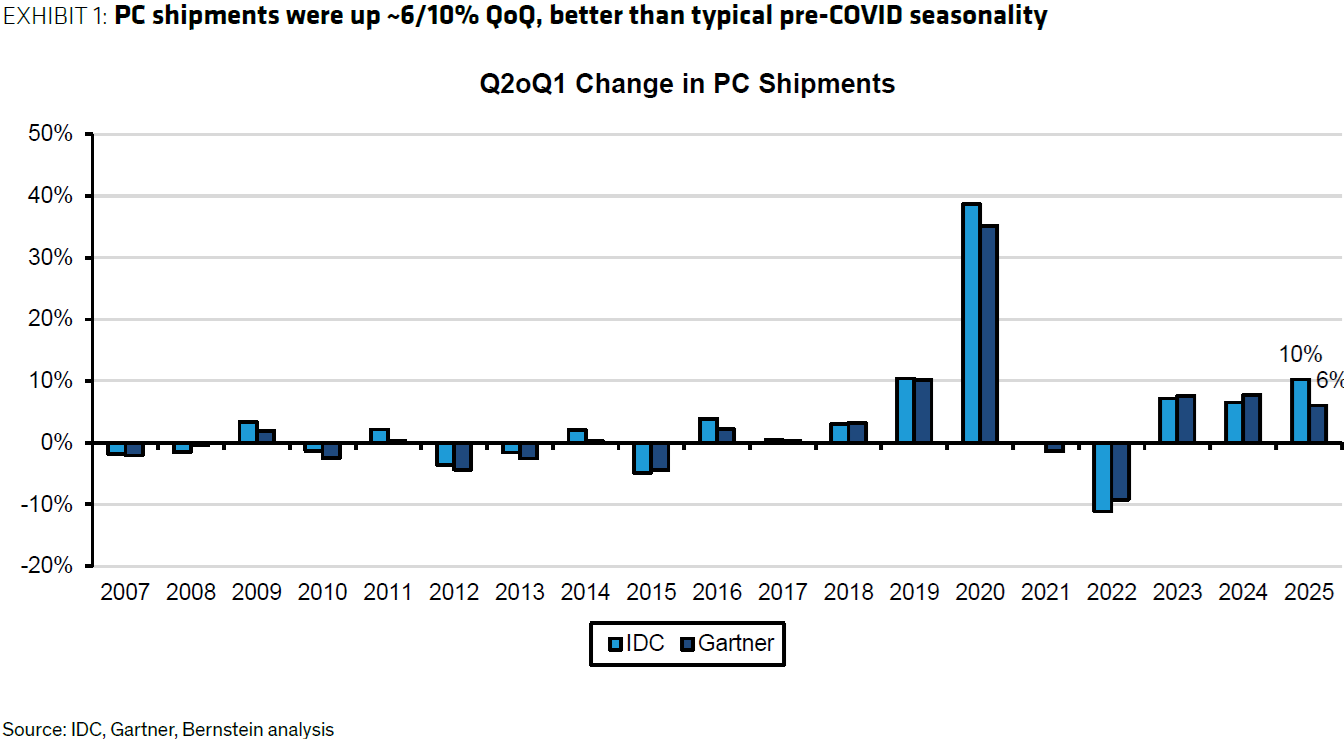 商用 PC 和 消费者 PC 分别增加 7 百万和 6 百万部。