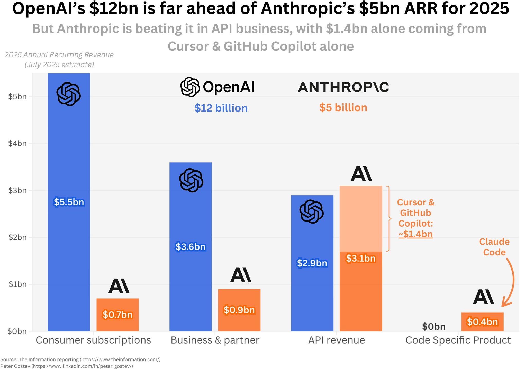 Anthropic 则强于 API 部分(尤其是 AI Coding 领域),共计 31 亿美元,其中 Cursor、GitHub Copilot 两家编程工具商贡献了 14 亿美元。Claude Code 也直接贡献了 4 亿美元。