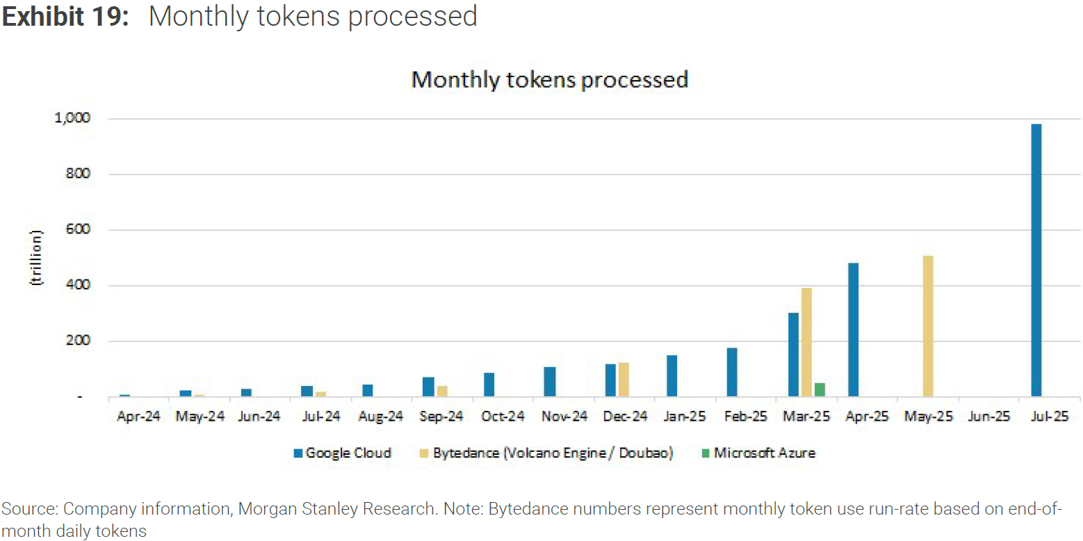IDC 咨询公司研究显示,2025H1 中国大模型公有云服务市场的总调用量为 536 万亿 Token,而去年全年才 114 万亿 Token。仅 2025 上半年的总调用量就是去年全年的 5x 倍。