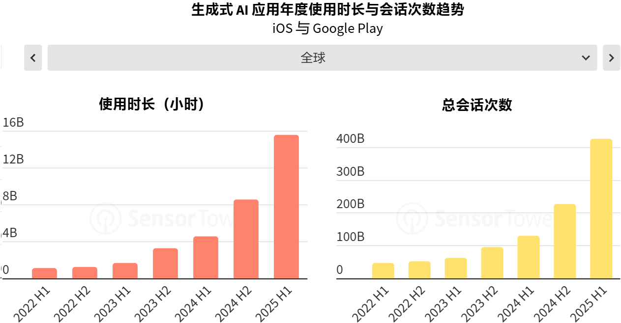生成式 AI 的下载量、应用内购买收入、用户时长与会话次数 2025H1