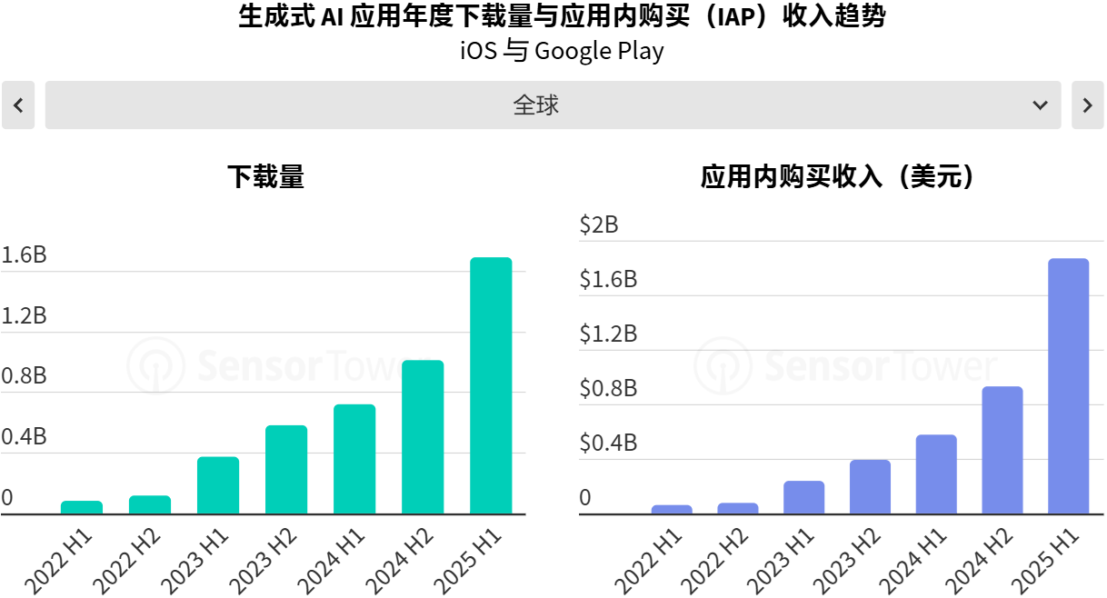 Sensor Tower 监测数据显示,2025H1 全球生成式 AI 应用(涵盖 AI 助手和 AI 内容生成器)的下载量接近 17 亿次,应用内购买(IAP)收入高达近 19 亿美元。消费者在 2025H1的支出对比 2024H2 增长了一倍。