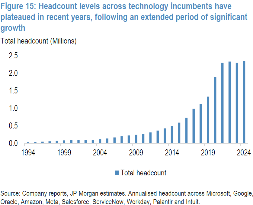 业绩最稳得两家公司 Apple 和 Microsoft,反倒人员增长最小。