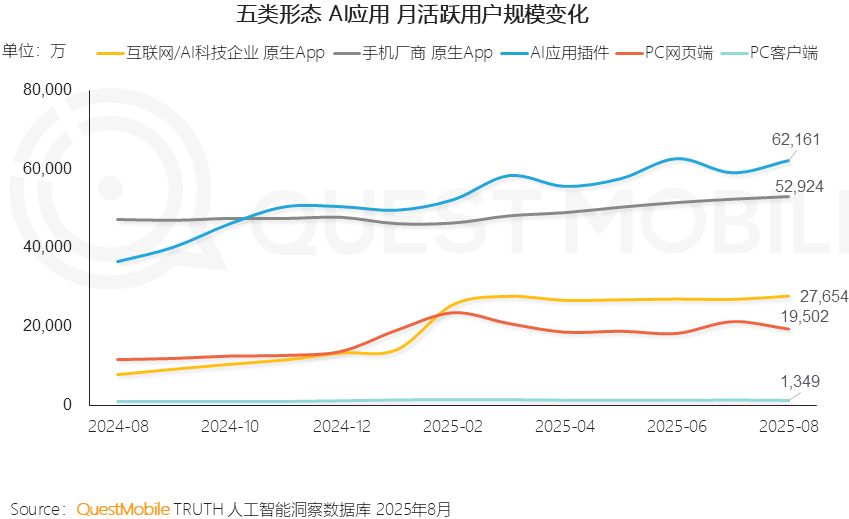 Quest Mobile 把目前的 AI 应用归为五大类:(1) 互联网公司的原生 App;(2) 手机厂商内置的原生 App;(3) AI 应用插件(在某个现有传统应用内置);(4) PC 网页端;(5) PC 客户端。