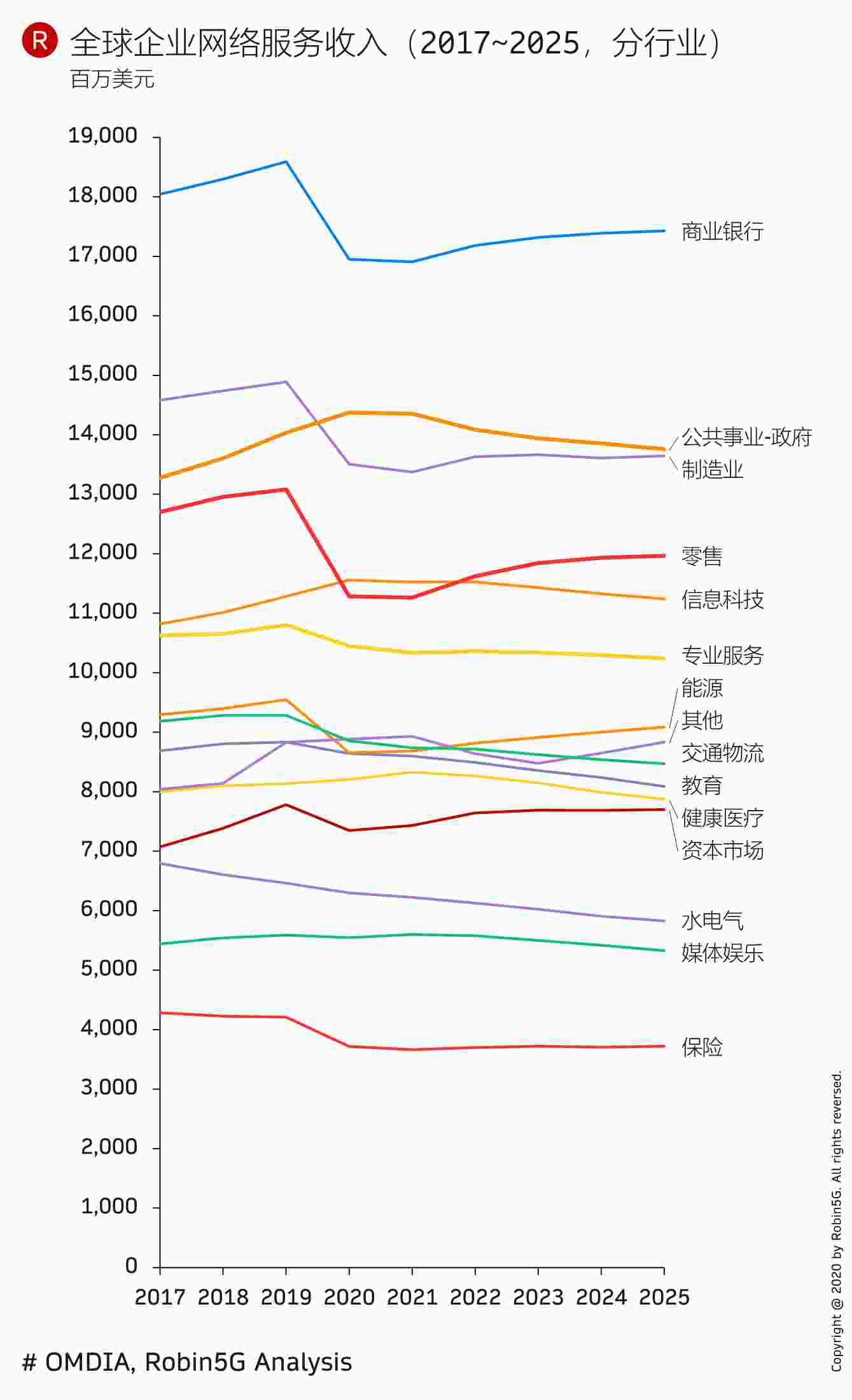 基于 OMDIA 的研究,商业银行、公共事业及政府、制造位居 Top 3。
