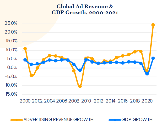 可以看到 2000 年后的大部分时间,广告行业和 GDP 呈现很大的相关性;而且在 2000 年互联网泡沫破灭和 2008 金融危机,广告行业的下行远超 GDP。
