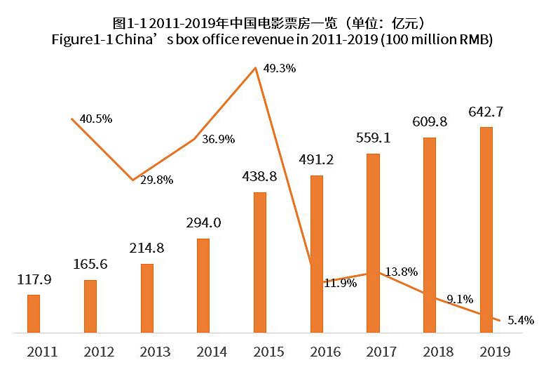 2011 年起,中国电影票房保持高速上涨趋势,到 2019 年收入规模达到了 642.7 亿元。