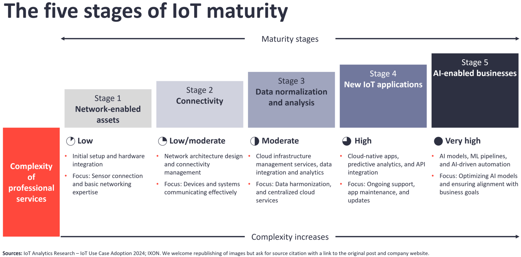 几乎所有企业都会存在不同程度的 IoT 应用。研究机构 IoT Analytics 给出了一个参考框架,用来定义企业物联网项目的演进成熟度。