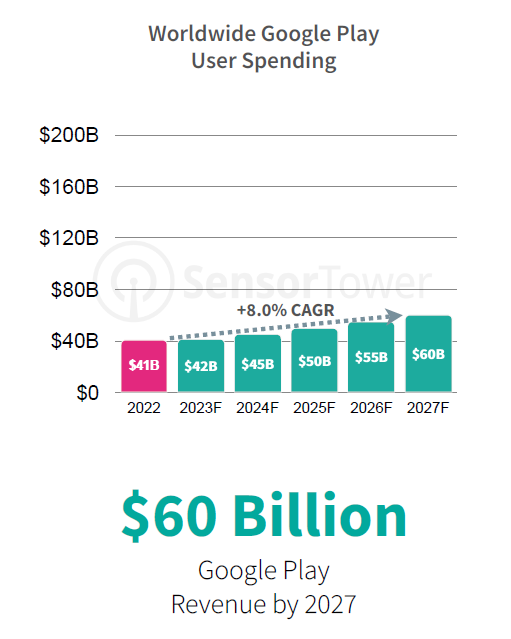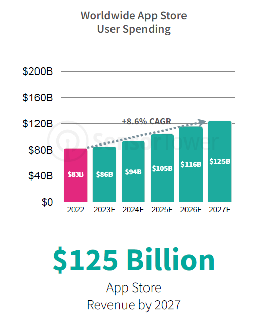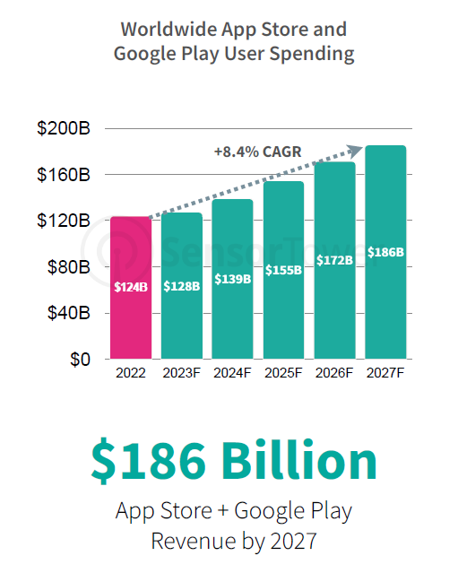 Sensor Tower 的研究显示,2022 年 AppStore 和 Google Play 全球用户开支为 1,240 亿美元。预计 2027 年数字将攀升到 1,860 亿美元,CAGR 为 +8.4%。