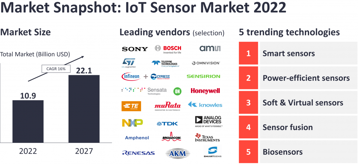 IoT Analytics 咨询公司估计,全球物联网传感器市场将从 2022 年的 109 亿美元增长到 2027 年的 221 亿美元,年复合增长率 16%。