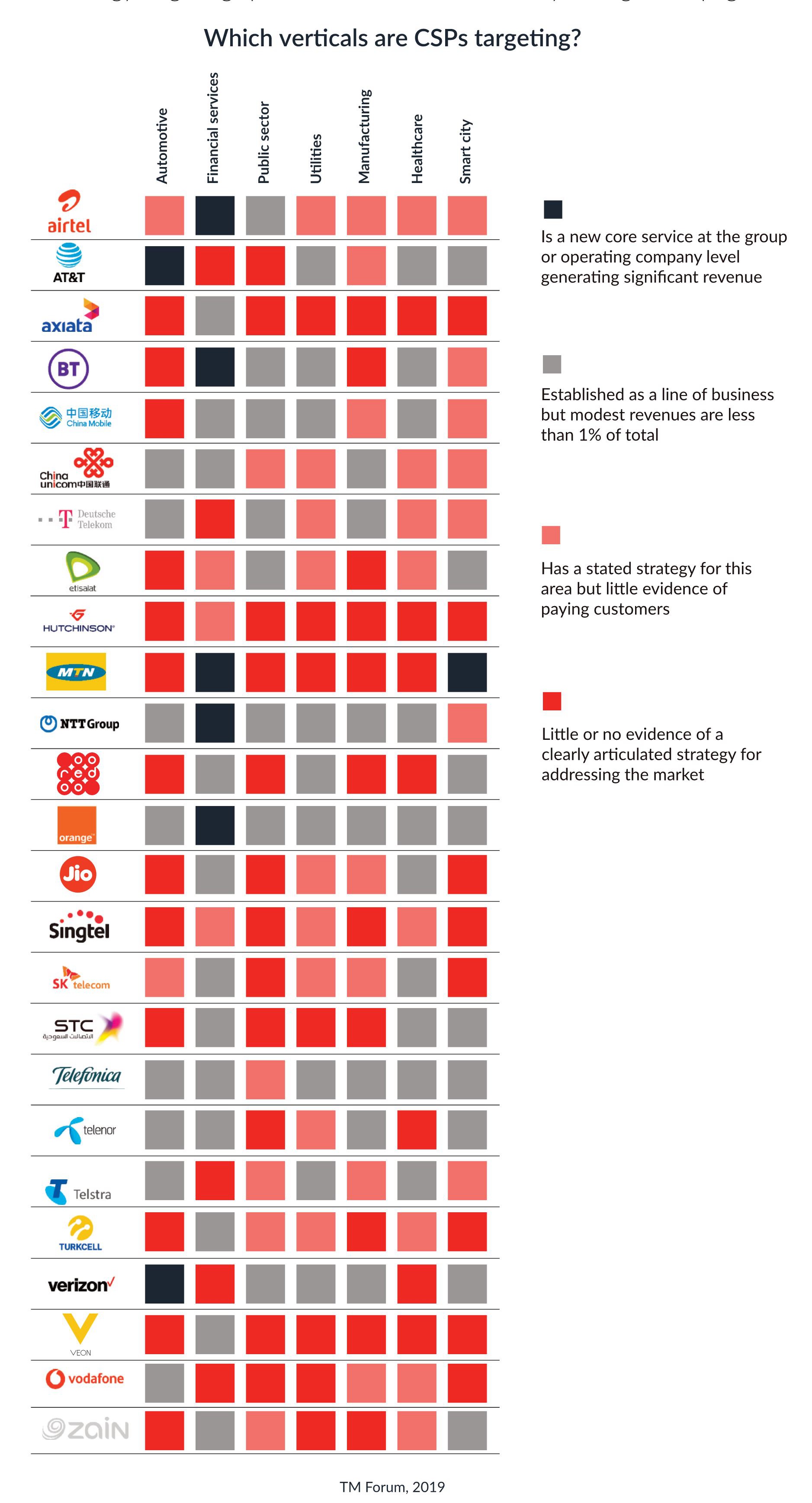 TMF 2019 针对全球 Top 25 运营商在垂直行业的着力情况进行了一轮研判: