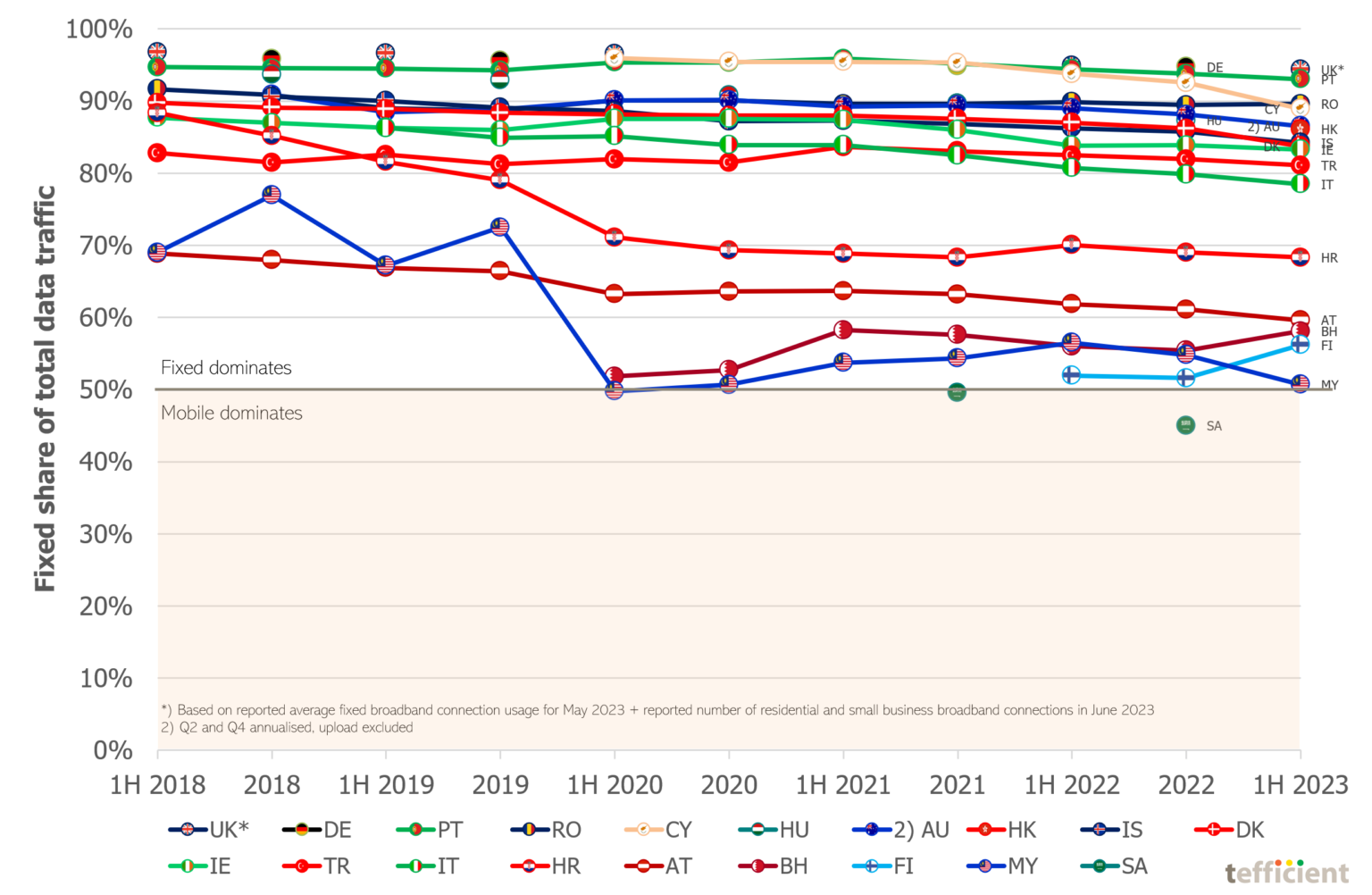 注:移动流量 DOU 都是 50GB/月,不代表当地数字经济是一样发达。因为不同地区家庭宽带所分流的流量使用有巨大差别。