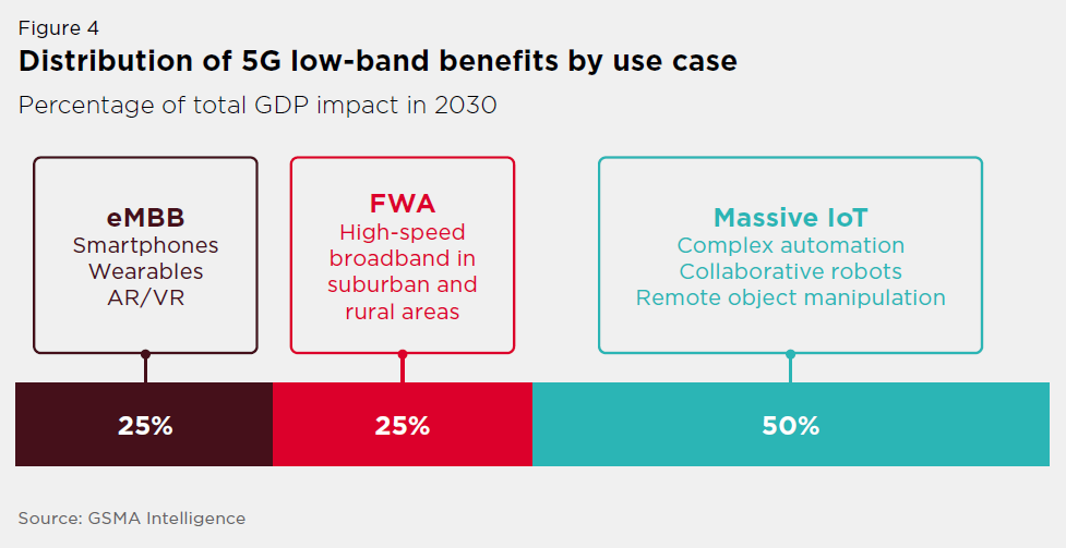 GSMA 认为低频率 5G 的部署具有广泛的经济价值,从用例看,Massive-IoT 会影响 50% GDP,eMBB 和 FWA 次之。