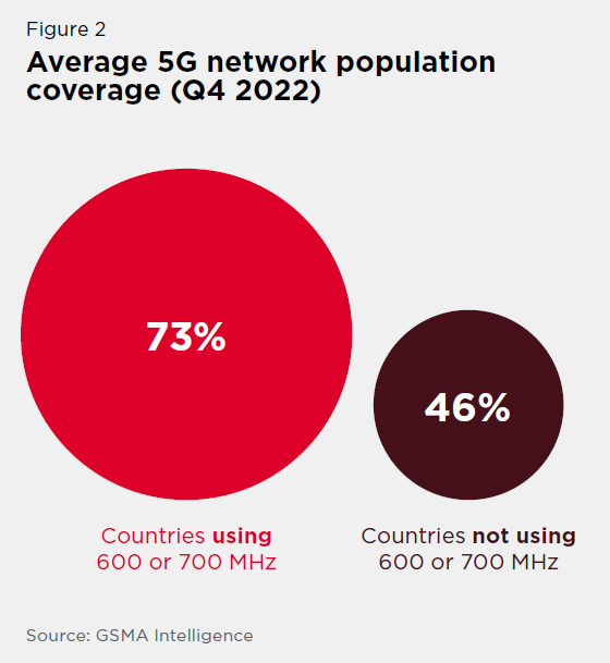 GSMA 研究显示,截止到 2022Q4,全球已商用 5G 的国家中,如果使用了 600/700Mhz 频率,这些国家平均 5G 网络的人口覆盖率为 73%。而作为对照组,没有使用频率的国家,5G 网络的人口覆概率只有 46%。差距还是很明显的。