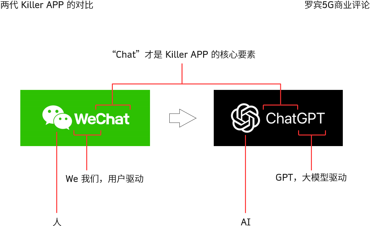 我们以上一代杀手级应用微信(WeChat)和当前正火的 ChatGPT 为例。两者的共同要素就是 “Chat”,而前者是 We(群众)人来驱动;而后者是 GPT,大模型 AI 驱动。