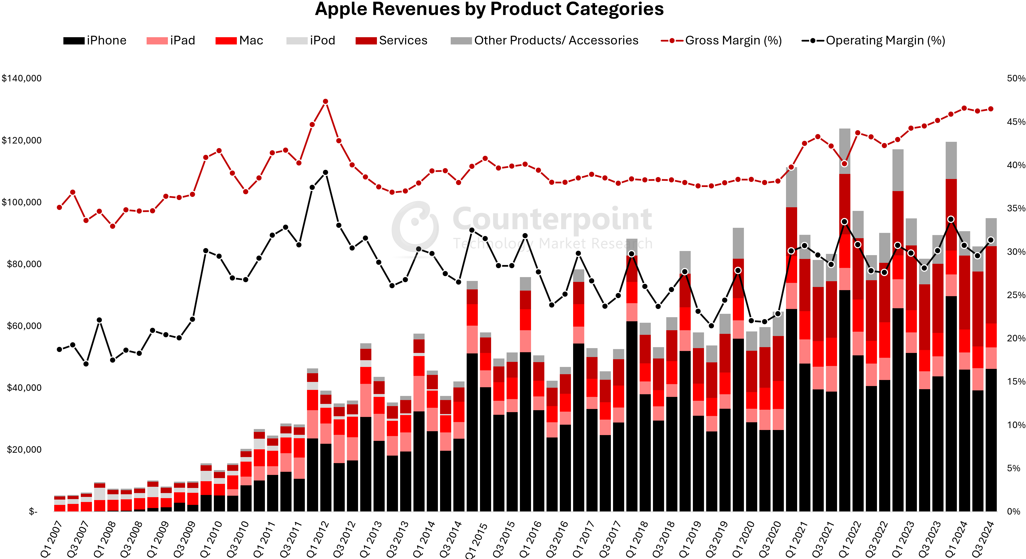 附图展示了 Apple 在 2007~2024Q3 每个季度的收入变化,可以看到虽然收入增加了很多倍,但毛利率和运营利润率基本处于较稳定的状态。