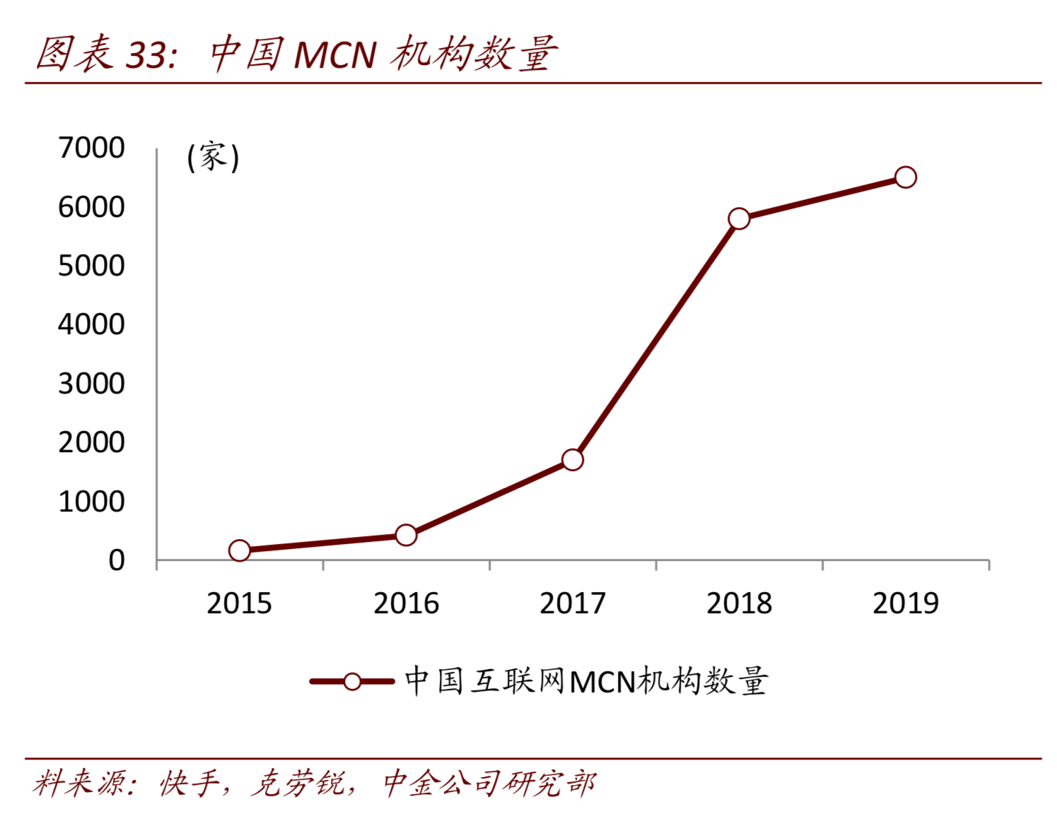 2019 年中国拥有各类 MCN 机构超过 6500 家,相比 2015 年提升 40 倍,通过专业化的运营体系,MCN 可以 在内容、流量及商业层面对网红进行赋能。