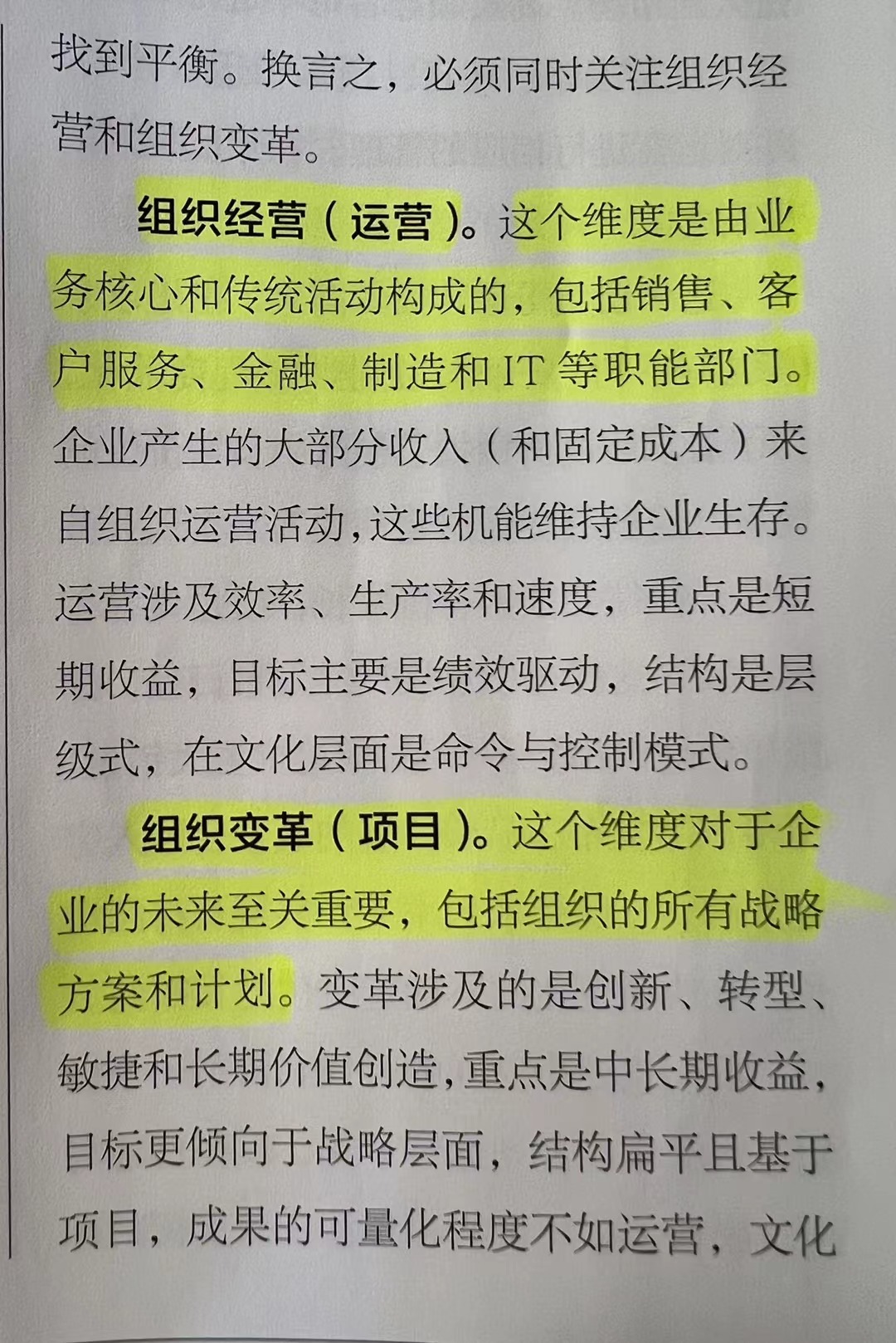 ③ 组织经营更贴近运营,而组织变革更贴近项目;过去项目是临时的,运营是永久的;现在倒过来了,因为变化才是永恒…